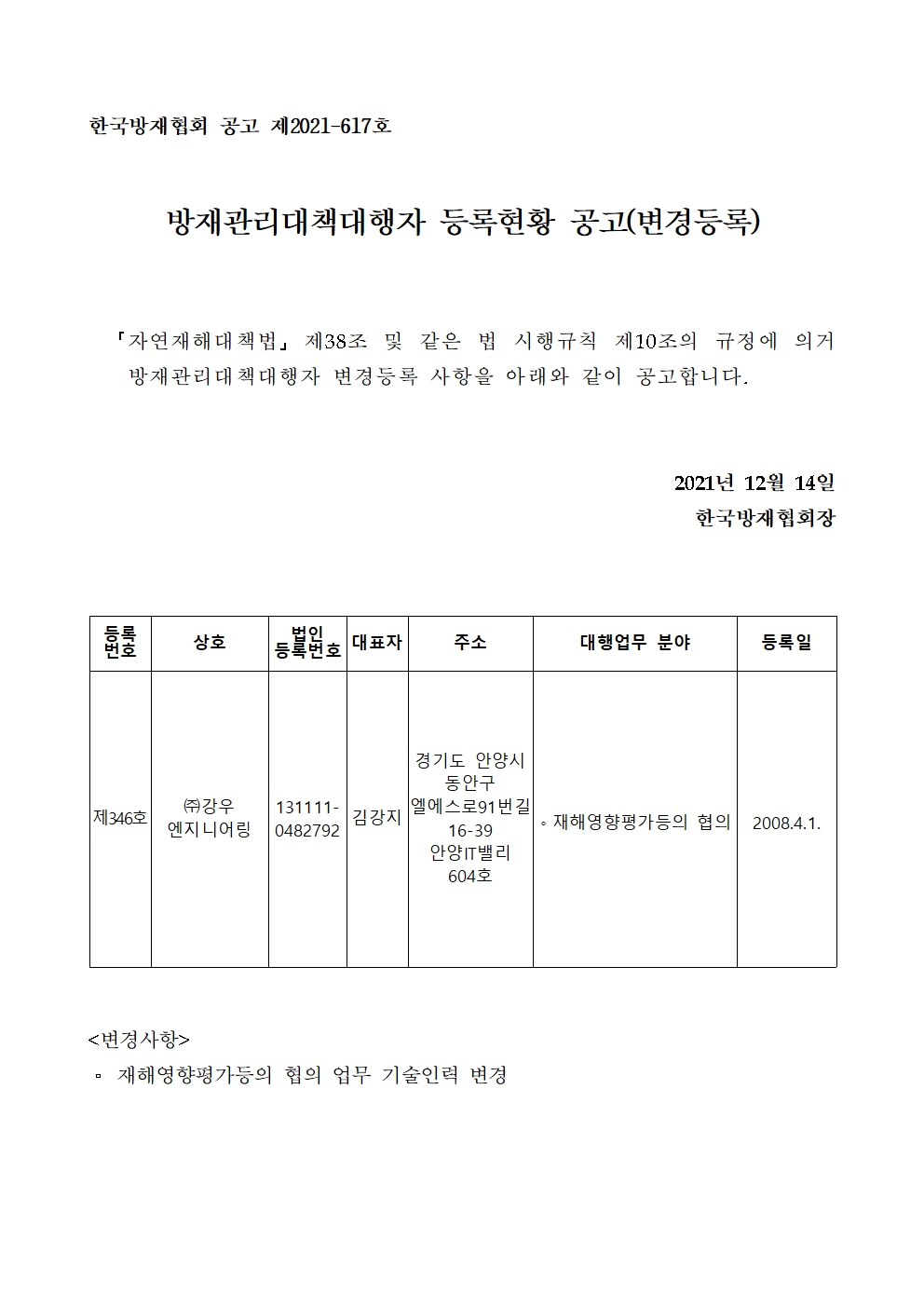 방재관리대책대행자 등록현황 공고(변경등록) - (주)강우엔지니어링 2021-12-14 공고문_제2021-617호_방재대행자 등록현황 공고(변경)_(주)강우엔지니어링.pdf (58657K) 목록보기 이전글방재관리대책대행자 등록현황 공고(변경등록) - (주)원우기술개발2021.12.14 다음글방재관리대책대행자 등록현황 공고(변경등록) - (주)화성엔지니어링2021.12.14