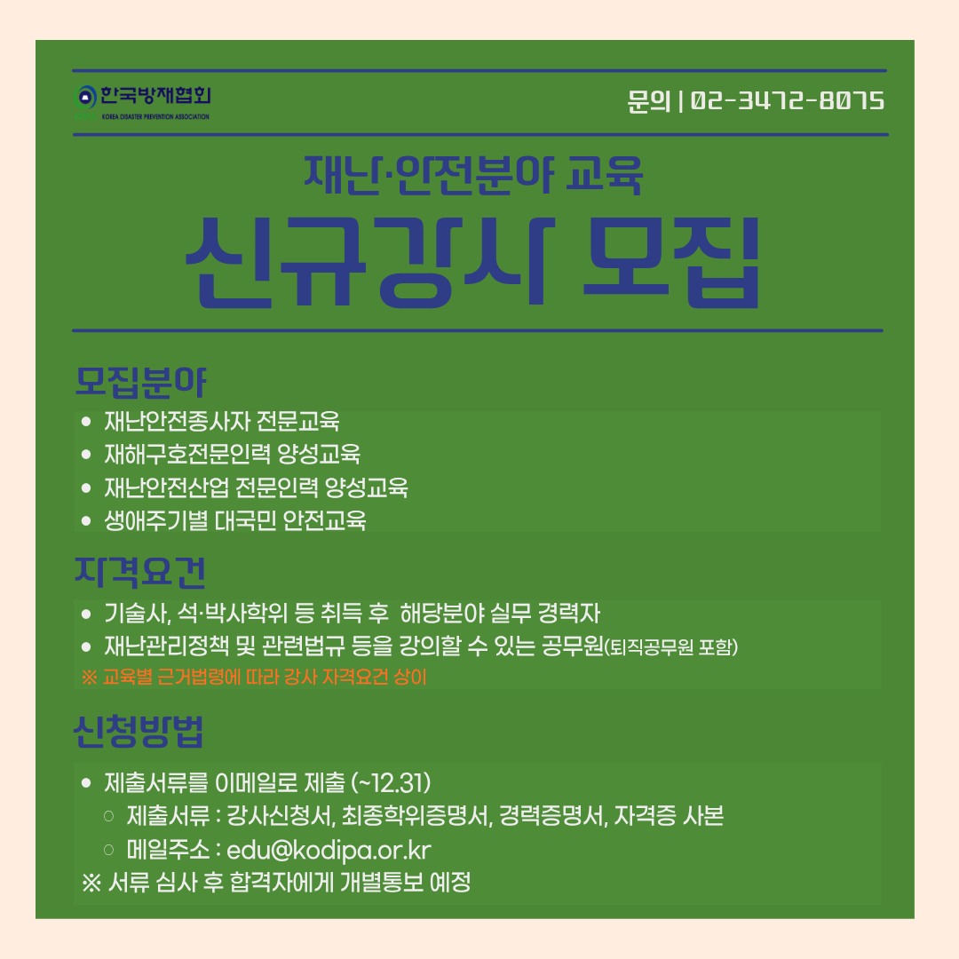 재난안전분야 신규강사 모집(~2025. 12. 31.까지) 2025-12-09 1. 재난안전분야 교육 신규강사 모집.pdf (191K) 2. 강사신청서(양식).hwp (49K) 목록보기 다음글기업재해경감활동 전문인력 양성교육 신규강사 모집(~2025. 12. 10.까지)2025.11.28