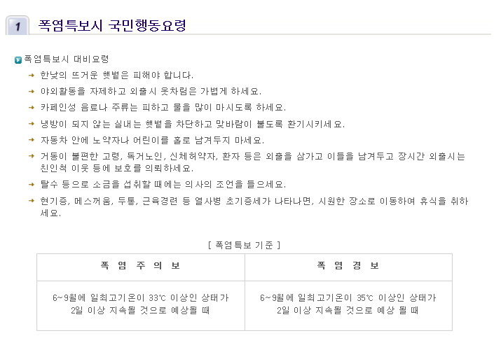 폭염 특보시 국민행동요령 2014-06-30 목록보기 이전글태풍 특보시 국민행동요령2014.07.01 다음글'방재분야 수행능력평가(PQ)제도 활성화'를 위한 토론회 자료집2014.06.26